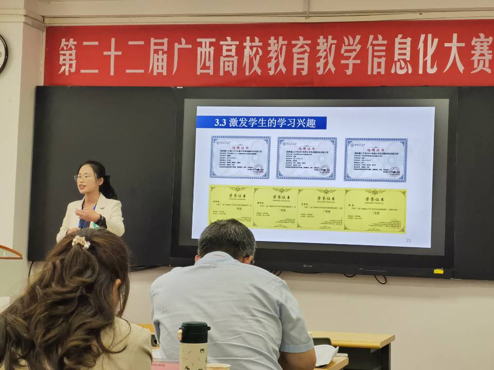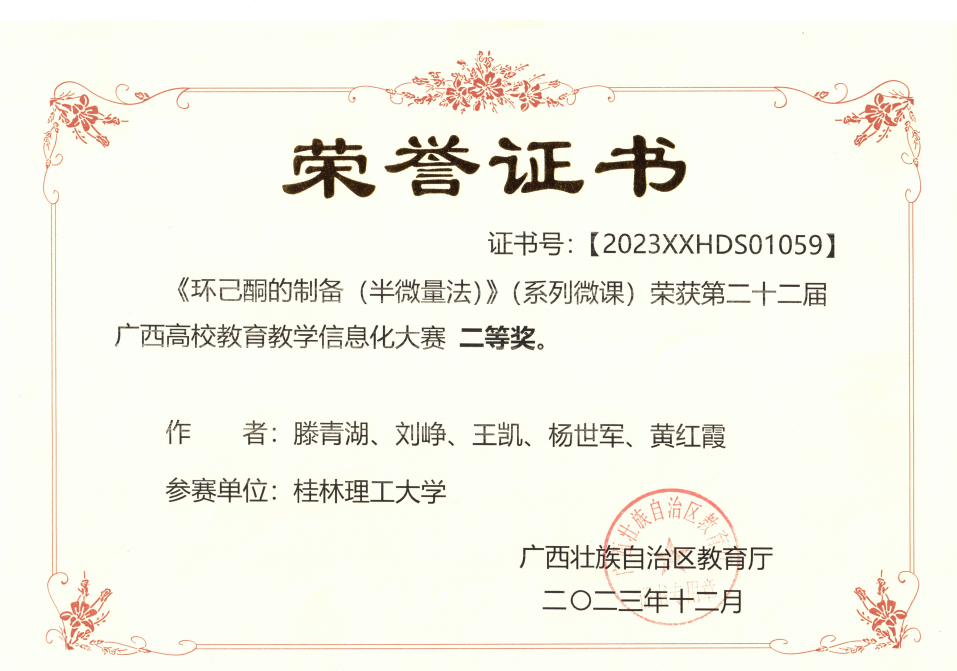 为推动beats365(中国区)-唯一官方网站教师主动适应信息化、智慧教学等新技术变革,积极开展教学,不断提高课程育人能力,推动高等教育内涵式发展,提升高校教师现代化信息技术与教育教学深度融合的能力,广西壮族自治区教育厅于2023年9月至11月期间举办了第二十二届广西高校教育教学信息化大赛,其中决赛于2023年11月11日—12日在广西科技大学文昌校区举行。beats365(中国区)-唯一官方网站化学化工教研室滕青湖老师参加此次比赛。 滕青湖老师的参赛作品为:环己酮的制备(半微量法)系列微课。滕老师从教学内容、教学组织、教学方法、语言教态、多媒体制作和视频录制等方面做了精心准备。从环己酮和手机的关系出发,充分激发学生的学习兴趣。课程内容中增加屠呦呦、余国琮等科学家的事迹,培养学生的专业自信。滕老师在系列微课中的授课过程思路清晰,重难点突出。在刘峥老师的悉心指导下,滕老师的系列微课在网评和现场决赛中荣获大赛的二等奖的优异成绩。 参赛老师合影 比赛现场 大赛获奖证书 (一审:滕青湖;二审:刘耀明;三审:何方)