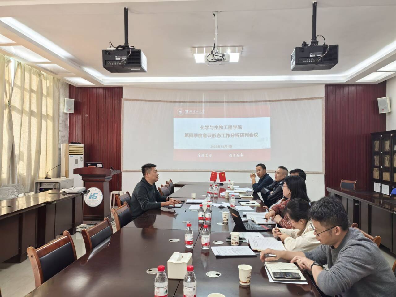 2025年12月1日下午,化学与生物工程学院在12217会议室召开了2025年第四季度意识形态工作分析研判会议。深入学习贯彻习近平总书记关于意识形态工作的重要论述,总结第三季度工作,分析当前形势,部署下一阶段重点任务。学院党政领导参加了此次会议,会议由学院党委书记彭代江主持。 会议首先传达学习了关于意识形态工作的最新文件精神及学校党委相关工作要求。随后,各相关负责人针对课堂教学管理、宣传阵地建设、网络舆情监控、师生思想动态、涉外交流合作、民族宗教工作等重点领域,系统梳理了工作开展情况、取得的成效以及存在的薄弱环节。与会人员结合学院专业特色,就多元文化冲击下的学生价值引领、科研学术活动中的政治把关、新媒体平台内容监管等关键问题展开热烈研讨,形成了多项针对性研判意见。 彭代江书记在总结讲话中强调,意识形态工作是落实立德树人根本任务的政治要求,学院作为意识形态工作前沿阵地,必须以“寸土不让”的决心守牢安全底线。他提出三点工作要求:一是强化理论武装,将党的创新理论与专业教学深度融合,通过“课程思政”示范课堂等形式,增强思想引领的实效性;二是严守阵地防线,严格落实新闻“三审三校”、学术活动审批等制度,密切关注师生思想动态,及时回应关切,加强人文关怀和心理疏导。提升网络舆情发现力、研判力、处置力,营造清朗网络空间;三是增强斗争本领,有效防范风险。增强风险意识和底线思维,提升对意识形态领域复杂情况的洞察力和驾驭力,敢于亮剑、善于斗争,对错误思潮和言论要旗帜鲜明地批驳抵制,切实维护学院政治安全和校园稳定。 学院将以此次会议为契机,持续完善意识形态工作长效机制,切实把研判成果转化为工作实效,为培养德智体美劳全面发展的社会主义建设者和接班人提供坚实思想保障,为学校事业高质量发展贡献学院力量。 会议现场 (一审:马文硕 二审:袁亚利 三审:李少华)