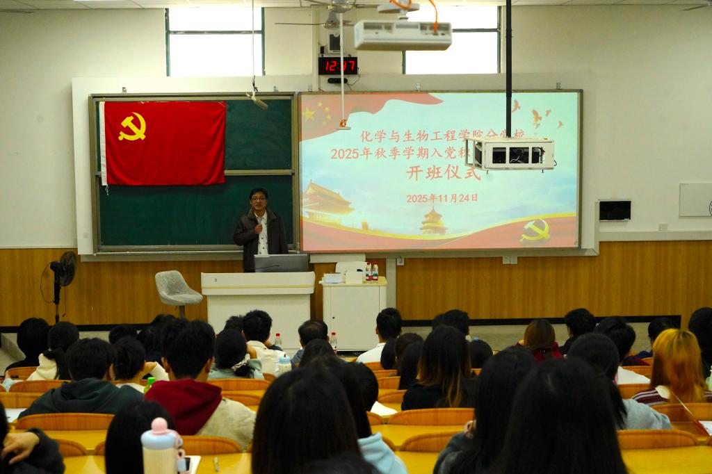 导航痕迹 当前位置: 首页 >> 党建工作 >> 党建工作 >> 正文 化学与生物工程学院分党校2025年秋季学期 入党积极分子培训班开班典礼顺利举行 作者:李学来 发布日期:2025-11-24 浏览次数: 11月24日中午12:30分,化学与生物工程学院分党校2025年秋季学期入党积极分子培训班在雁山05314举行开班典礼。化学与生物工程学院党委副书记李少华、组织员李学来以及研究生党支部书记黄道坤、朱皓出席了本次典礼。典礼由李学来老师主持。 典礼在庄严的国歌声拉开帷幕。典礼伊始,主持人介绍了到场的各位老师并宣布党校开班典礼正式开始。紧接着,在热烈的掌声中,学院党委副书记李少华老师作开班致辞。他指出要把学习贯彻党的创新理论作为思想武装中的重中之重,并同学习党史、新中国史、改革开放史和社会主义发展史结合起来。典礼上,由黄道坤老师对培训班纪律要求做具体说明。他希望培训班的每一位同学都能够严格遵守纪律要求,服从安排,展现出应有的组织性和先进性。开班典礼至此结束。 本期党校采取集中授课与自学相结合,旨在加深学员对党的认识,端正入党动机,坚定入党决心,从思想和行为两个方面严格要求自己,争取早日加入党组织。 典礼现场 (一审:李学来 二审:马文硕 三审:李少华) 上一条:联合分党校2025年秋季学期预备党员培训班开班典礼顺利举行 下一条:学院党委书记为2025年秋季学期发展对象培训班讲授《中国共产党党员的义务和权利》专题党课