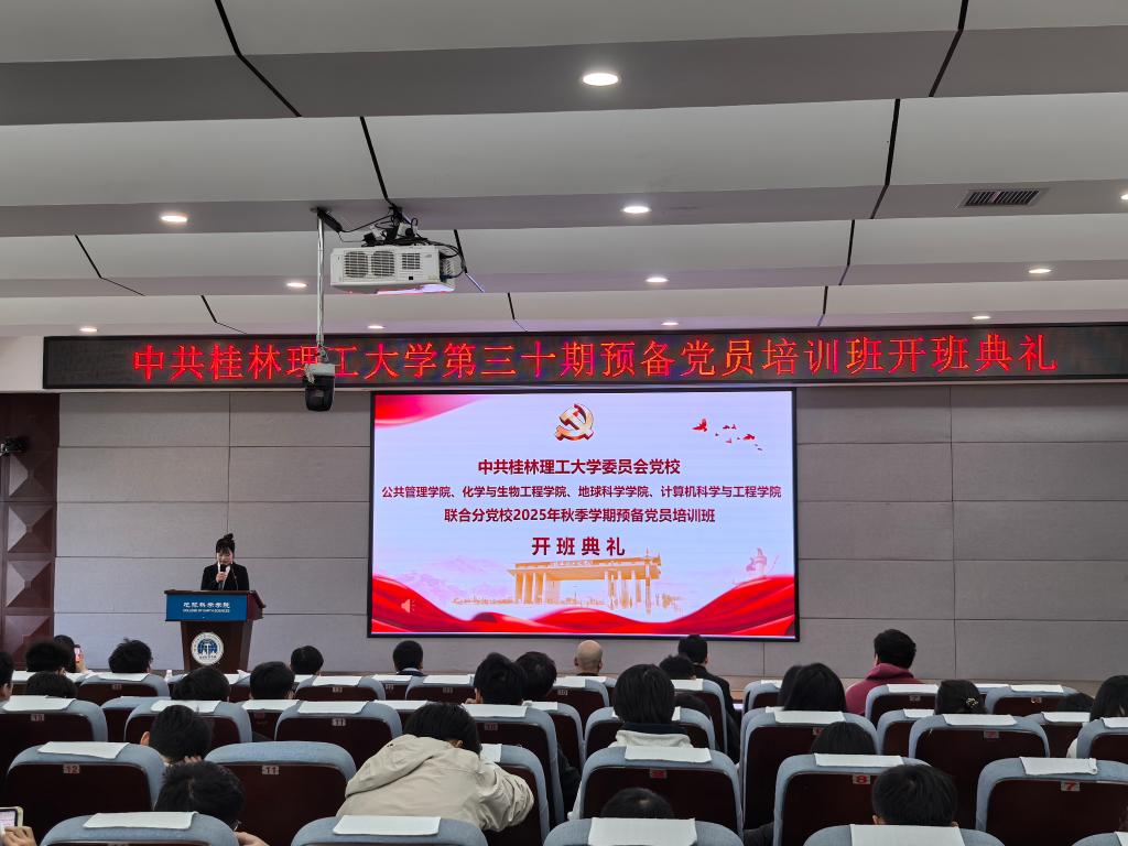 导航痕迹 当前位置: 首页 >> 党建工作 >> 党建工作 >> 正文 联合分党校2025年秋季学期预备党员培训班开班典礼顺利举行 作者:李学来 发布日期:2025-11-25 浏览次数: 11月25日中午12:20分,化学与生物工程学院、地球科学学院、计算机科学与工程学院、公共管理学院联合分党校第三十期预备党员培训班在雁山01501报告厅举行开班典礼。各学院党校领导和教务员出席了本次典礼,典礼由公共管理学院党委副书记夏勇超老师主持。 典礼在庄严的国歌声拉开帷幕。典礼伊始,主持人介绍了到场的各学院领导并宣布党校开班典礼正式开始。紧接着,在热烈的掌声中,公共管理学院党委书记陆平作开班致辞。他希望学员们能够珍惜这一次难得的机会,端正学习态度,做到率先学习、科学学习和终身学习。典礼上,时香丽老师对培训班纪律要求做具体说明。他强调全体学员要严守党校培训纪律,珍惜学习机会,进一步锤炼党性修养,专心听讲、勤做笔记,确保培训取得扎实成效。开班典礼至此结束。 本期党校培训采用集中授课与自主学习相融合、理论钻研与实地调研相结合的形式开展,旨在引导学员深化对党的认知,端正入党初心,坚定入党信念,从思想觉悟与言行举止双维度严格自我要求,全力向党组织靠拢,争取早日成为一名合格党员。 党课现场 (一审:李学来 二审:马文硕 三审:李少华) 上一条:学院赴灌阳县三树村开展乡村振兴对口帮扶活动 下一条:化学与生物工程学院分党校2025年秋季学期 入党积极分子培训班开班典礼顺利举行