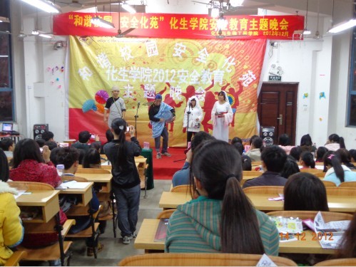 为了响应学校冬季学生安全教育月的文件精神,加强同学们的安全意识,化生学院于12月14日晚在04110教室举办2012安全教育主题晚会。出席本次晚会的嘉宾有院团委书记周德海老师、10级辅导杨晓老师以及12级辅导何宗辉老师。化生学院三百多名学生参加了晚会。