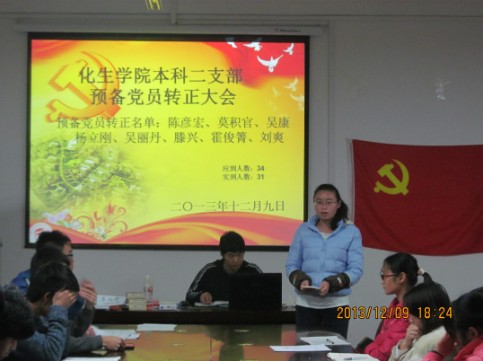 会议第一个议题是讨论柳小建等4名发展对象的发展问题, 第二个议题是讨论陈彦宏等8名预备党员的转正问题。以上几名同学平时能够接受党的教育和管理,较好的完成组织交办的各项任务,积极参加党校的培训班,刻苦学习党的理论知识,加强自身的党性修养,关心时事,在平时的工作、学习、生活中,关心团结同学,积极带动身边同学完成学院的各项任务,努力学习科学文化知识,成绩优异。在同学中间,较好的发挥了先锋模范带头作用。会议期间严格遵守正确的流程,最终经过无记名投票,柳小建等4名发展对象成为中共预备党员,陈彦宏等8名同志顺利转正成为中共党员。