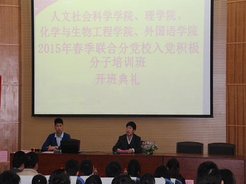 2015年4月7日12时,化学与生物工程学院、人文社会科学学院、理学院、外国语学院2015年春季联合分党校入党积极分子培训班开班典礼在beats365(中国区)-唯一官方网站雁山校区12栋报告厅顺利举行。出席本季开班典礼的领导老师有人文学院党委书记江云清老师、理学院党委副书记郝佳文老师、人文学院党委副书记汪晟老师及各学院辅导员。参加本期党校学习的学员为化学与生物工程学院、理学院、外国语学院和人文学院全体入党积极分子。 典礼由化学与生物工程学院12级辅导员何宗辉老师主持。