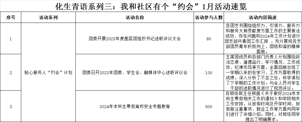 导航痕迹 当前位置: 首页 >> 学生工作 >> 学生活动 >> 正文 【化生青语】化生青语系列三:我和社区有个“约会”1月活动速览 作者: 发布日期:2024-01-18 浏览次数: 为扎实推进学校“一站式”学生社区综合管理模式建设试点工作和化学与生物工程学院“三全育人”综合改革工作,提升学院“一站式”学生社区影响力,化学与生物工程学院将“一站式”学生社区以“党建+X”模式为基础,结合学院【化生青语】育人文化,将学院育人体系下沉社区,打造【化生青语】系列三——我和社区有个“约会”特色活动。1月份,结合学院社区团队,按照学院社区我和社区有个“约会”特色品牌活动,主要开展贴心服务人“约会”计划,同助力学院学子发展。按照“约会计划”,学院举办活动如下。 (一审:张伟颀 二审:黄道坤 三审:李少华) 上一条:学院开展2024年春季学期“开学第一课”专题教育 下一条:学院开展2024年本科生寒假离校安全专题教育