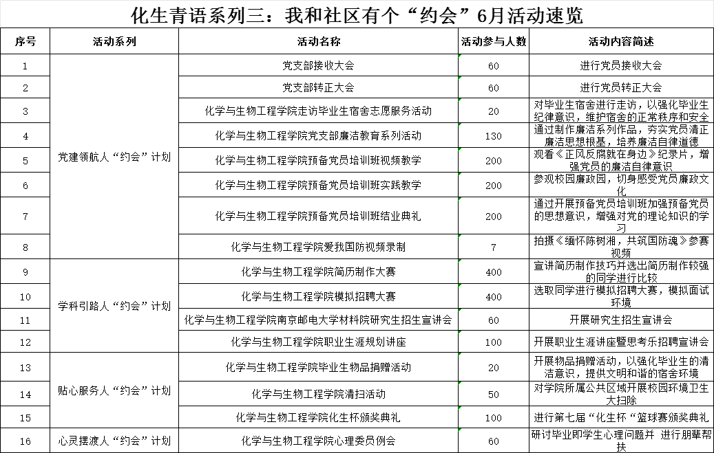 导航痕迹 当前位置: 首页 >> 学生工作 >> 学生活动 >> 正文 【化生青语】化生青语系列三:我和社区有个“约会”6月活动速览 作者: 发布日期:2024-06-30 浏览次数: 为扎实推进学校“一站式”学生社区综合管理模式建设试点工作和化学与生物工程学院“三全育人”综合改革工作,提升学院“一站式”学生社区影响力,化学与生物工程学院将“一站式”学生社区以“党建+X”模式为基础,结合学院【化生青语】育人文化,将学院育人体系下沉社区,打造【化生青语】系列三——我和社区有个“约会”特色活动。6月份,结合学院社区团队,按照学院社区我和社区有个“约会”特色品牌活动,党建领航人“约会”计划、学科引路人“约会”计划、贴心服务人“约会”计划、心灵摆渡人“约会”计划四个系列活动同步推进,共同助力学院学子学习、生活、就业等方面的发展。按照“约会计划”,学院举办活动如下。 (一审:陈千癸 二审:黄道坤 三审:李少华) 上一条:【化生青语】化生青语系列三:我和社区有个“约会”7月活动速览 下一条:学院举办2024年春季学期校园清扫活动