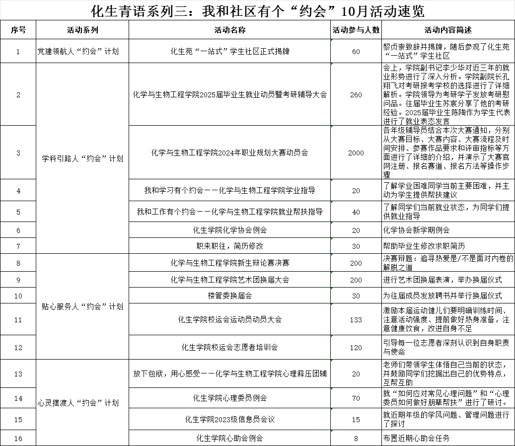 导航痕迹 当前位置: 首页 >> 学生工作 >> 学生活动 >> 正文 【化生青语】化生青语系列三:我和社区有个“约会”10月活动速览 作者: 发布日期:2024-10-31 浏览次数: 为扎实推进学校“一站式”学生社区综合管理模式建设试点工作和化学与生物工程学院“三全育人”综合改革工作,提升学院“一站式”学生社区影响力,化学与生物工程学院将“一站式”学生社区以“党建+X”模式为基础,结合学院【化生青语】育人文化,将学院育人体系下沉社区,打造【化生青语】系列三——我和社区有个“约会”特色活动。10月份,结合学院社区团队,按照学院社区我和社区有个“约会”特色品牌活动,党建领航人“约会”计划、学科引路人“约会”计划、贴心服务人“约会”计划、心灵摆渡人“约会”计划四个系列活动同步推进,共同助力学院学子学习、生活、就业等方面的发展。按照“约会计划”,学院举办活动如下。 (一审:陈千癸 二审:黄道坤 三审:李少华) 上一条:学院举办2024年研究生国家奖学金经验交流分享会 下一条:学院化学协会召开秋季学期工作例会