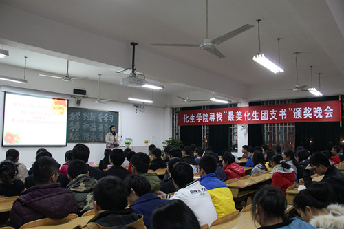 为促进班级团支部建设,化生学院团委特组织开展寻找“最美化生团支书”活动,活动通过微博、微信、空间点赞及转载等评选方式,广泛动员,共评选出四名“最美化生团支书”及六名“优秀团支书”。活动开始,院党委副书记陶剑飞老师发表精彩讲话,讲话中陶副书记首先对当选“最美化生团支书”及“优秀团支书”的同学表示祝贺和肯定,对本次活动的成功举办给予了高度评价,并勉励全院各级团学干部时刻牢记使命,以高度的责任感和奉献精神开创化生学院团学工作的新局面。