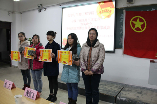 12月26日晚,化学与生物工程学院在励新楼206室举行寻找“最美化生团支书”活动颁奖晚会暨五四红旗团支部建设经验交流会,本次晚会是对过去两个月化生学院打造特色团支部活动的总结。出席本次活动的嘉宾有学院党委副书记陶剑飞、学院团委学生会主席团成员及各班班长、团支书。