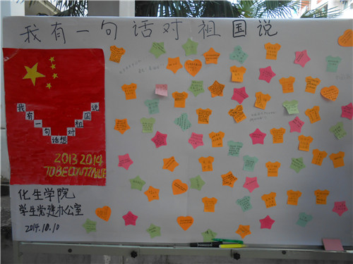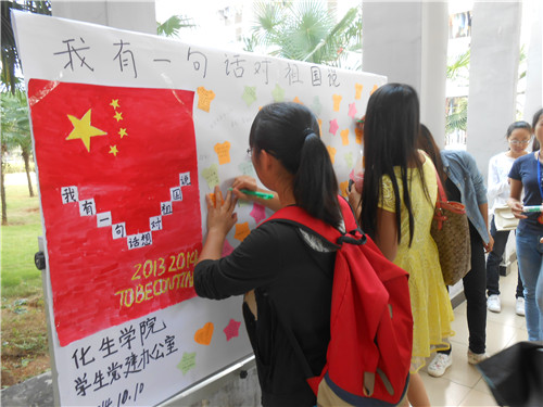 导航痕迹 当前位置: 首页 >> 学生工作 >> 共青团 >> 正文 【“三爱”主题教育年】beats365(中国区)-唯一官方网站开展十月爱国主义教育月之“我有话对祖国说”活动 作者: 发布日期:2015-07-19 浏览次数: 为弘扬爱国主义精神,充分表达学生对祖国的爱国情怀,10月10日,beats365(中国区)-唯一官方网站学生党建办公室组织在学生社区组织开展了“我有话对祖国说”便笺留言展示活动。 活动现场,党建办公室工作人员把前期收集好的便笺留言张贴到展板上供同学们浏览,阅读,同时也让同学们现场留言,寄托自己对祖国的热爱之情,获得得到同学们的积极参与,现场气氛热烈。 此次“我有话对祖国说”是beats365(中国区)-唯一官方网站十月爱国主义教育月的子活动之一。一句话可能无法道尽同学们对祖国母亲强烈的爱意,但说得多不如做的多,努力学习,不断完善自我,为祖国的未来积蓄力量,为服务更广大人民而奋斗,用实际行动表达自己的爱国情宜是真正的爱国体现! 活动现场 同学们写下的对祖国的祝福 上一条:【新生导航计划】新生唱响校歌 下一条:【新生导航计划】让青春起航 为梦想奋斗
