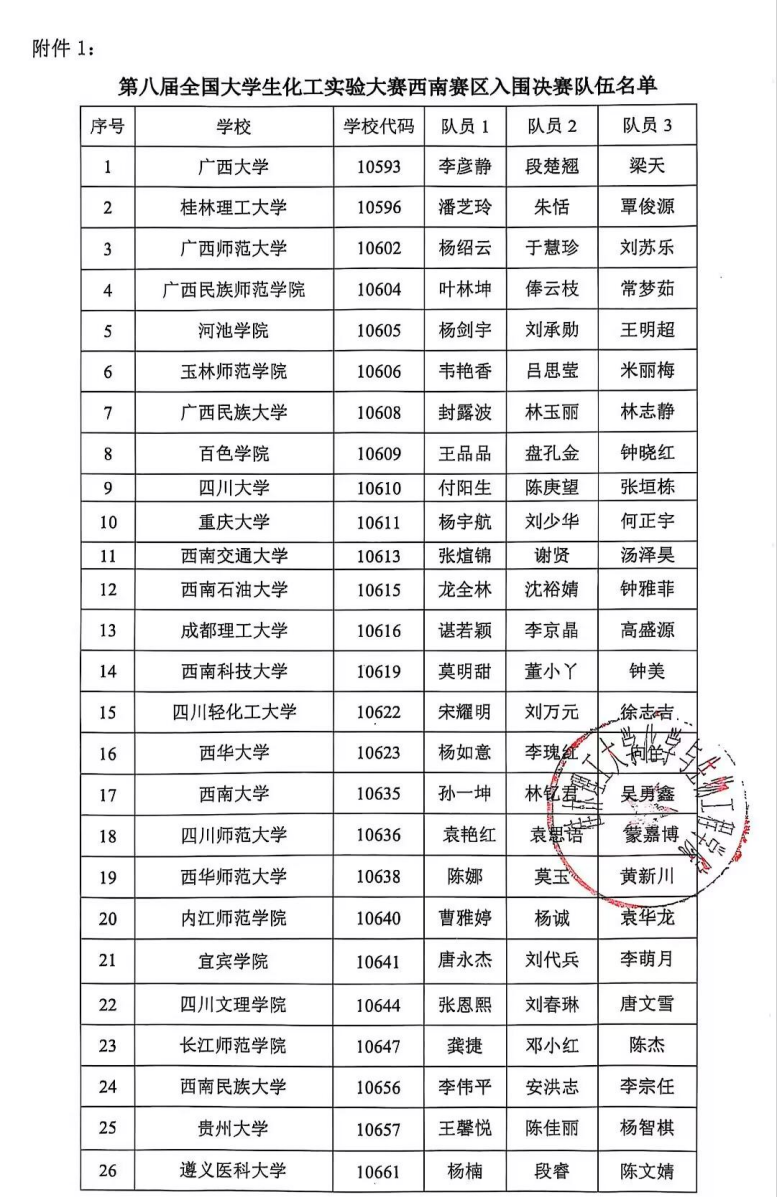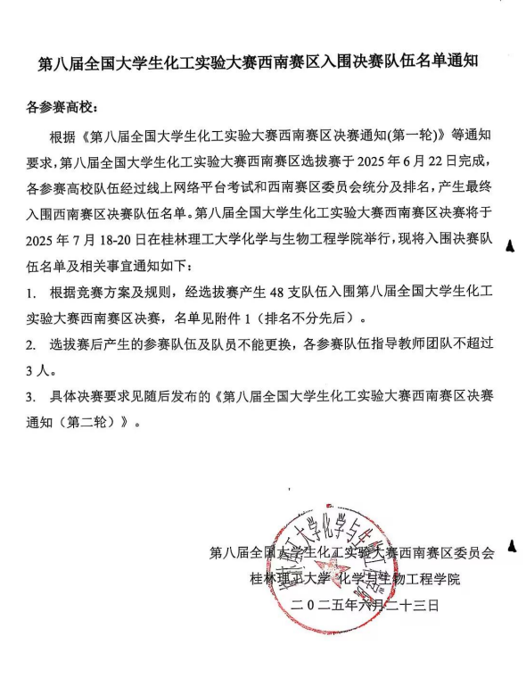 导航痕迹 当前位置: 首页 >> 新闻资讯 >> 通知公告 >> 正文 第八届全国大学生化工实验大赛西南赛区入围决赛队伍名单通知 作者: 发布日期:2025-06-24 浏览次数: 上一条:第八届“中控杯”全国大学生化工实验大赛西南赛区决赛通知 (第三轮) 下一条:【学术报告通知】西南大学胡卫华教授学术报告