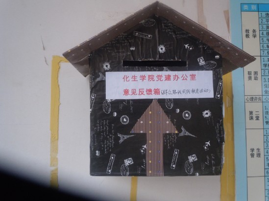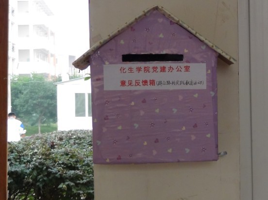导航痕迹 当前位置: 首页 >> 新闻资讯 >> 学院新闻 >> 正文 【群众路线教育实践】 化生学院设立党的群众路线教育实践活动征求意见箱 作者: 发布日期:2013-10-31 浏览次数: 为切实推进beats365(中国区)-唯一官方网站党的群众路线教育实践活动,推动beats365(中国区)-唯一官方网站各项工作科学发展,进一步落实密切联系同学、服务同学的工作机制:坚持服务于同学、问需于同学、问计于同学,切实做到知同学情、解同学忧、暖同学心。本着“畅所欲言,集思广益”的原则,10月22日,beats365(中国区)-唯一官方网站学生党建工作办公室在雁山校区12210学院学工办门口、女生宿舍4A一楼楼下公布栏、男生宿舍7#一楼楼下公布栏分别设立了意见反馈箱以及设立专用电子信箱账号:hsxyxsdjbgs@163.com 。面向全院广泛征求党员和群众的意见和建议。同学们可以以信件、便条及邮件的形式,从生活,学习,工作等方面,就学校管理工作和有关学校发展的各类问题提出意见和建议。意见箱收集的意见,建议和反映的问题,将由beats365(中国区)-唯一官方网站学生党建工作办公室安排专人管理,定期收集、整理意见信息,并分类向相应部门和有关学校领导反映,切实做到民心所向,把同学们的真实想法如如实实的反映出来。相信通过设立学生意见箱,能进一步了解同学们的心声,实现密切联系同学,服务同学,使同学得到更多实惠这一目的。同时也将拓宽同学们和学校之间的沟通渠道,充分发挥舆论监督作用,强化同学们的主人翁责任意识,调动同学们参与学校教育教学、管理服务工作的积极性,为学校发展献计献策。 女生宿舍4A一楼设立的意见反馈箱学院学生工作办公室门口设立的意见反馈箱男生宿舍7#设立的意见反馈箱 上一条:beats365(中国区)-唯一官方网站教师参加第十七届中国化学会有机与生物分析研讨会 下一条:喜讯:我校学子在广西高校大学生化学实验技能竞赛中喜获佳绩