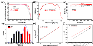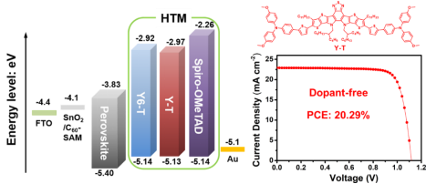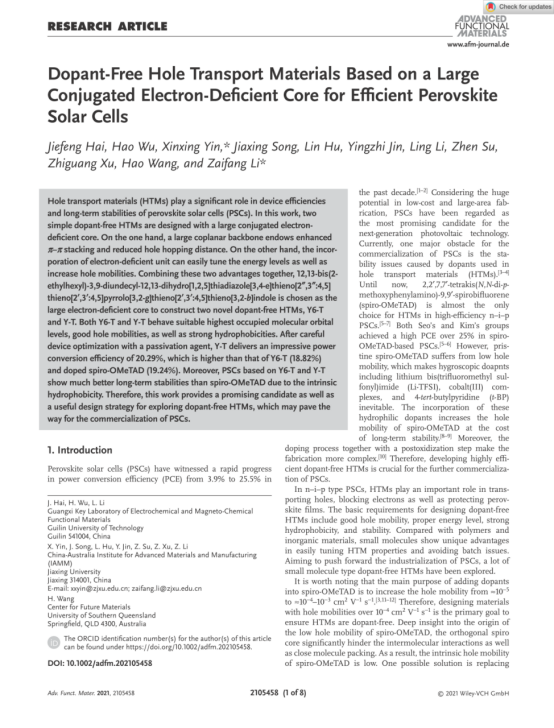 导航痕迹 当前位置: 首页 >> 新闻资讯 >> 学院新闻 >> 正文 beats365(中国区)-唯一官方网站海杰峰副教授在国际知名期刊《Advanced Functional Materials》上发表免掺杂空穴传输材料修饰钙钛矿太阳能电池研究成果 作者:吴浩 发布日期:2021-09-27 浏览次数: 近日,beats365(中国区)-唯一官方网站海杰峰副教授与嘉兴学院中澳先进材料与制造研究院尹新星博士课题组在免掺杂空穴传输材料修饰的钙钛矿太阳能电池方面取得重要研究进展。9月21日,该研究成果以“Dopant-Free Hole Transport Materials Based on a Large Conjugated Electron-Deficient Core for Efficient Perovskite Solar Cells”为题在《Advanced Functional Materials》(SCI一区TOP期刊,影响因子18.8)上发表。 全文链接为:https://doi.org/10.1002/adfm.202105458 目前有机/无机杂化钙钛矿电池(PSCs)发展迅猛,其光电转化效率(PCE)已经突破了25%。空穴传输材料(Hole transport materials, HTMs)作为钙钛矿电池的重要组成部分之一,对器件的效率、稳定性以及大规模应用具有至关重要的影响。目前高效率的PSCs通常选用成本昂贵的spiro-OMeTAD作为空穴传输层,但是spiro-OMeTAD需要采用锂盐、钴盐、叔丁基吡啶等掺杂剂来提升其迁移率和导电性,这些亲水分子不利于电池的稳定性,因此低成本免掺杂空穴传输材料的开发对于高效稳定PSCs的商业化非常重要。海杰峰副教授和尹新星博士等人首次将具有缺电子属性的DA’D大稠环作为中心核和三苯胺单元作为端基构建了两个新型HTM材料Y6-T和Y-T。两个小分子材料具有匹配的能级、高空穴迁移率以及较好的疏水性。经钝化处理的基于Y-T免掺杂空穴传输层钙钛矿电池展现出令人满意的20.29%效率,高于基于Y6-T电池(18.82%)和基于spiro-OMeTAD电池(19.24%)。同时基于这两种HTMs的电池器件表现出比spiro-OMeTAD电池更加优异的稳定性。这项工作为免掺杂HTM材料提供了一种有效的设计策略,同时对钙钛矿电池商业化起到一定的推动作用。 海杰峰副教授、2019级研究生吴浩和嘉兴学院尹新星博士为该论文的共同第一作者,beats365(中国区)-唯一官方网站为第一完成单位。以上研究工作得到广西自然科学基金面上项目和广西电磁化学功能物质重点实验室基金等资助。 论文相关表征及性能检测 上一条:beats365(中国区)-唯一官方网站刘勇平教授科研团队在(光)电催化领域取得重要研究进展 下一条:学院顺利完成2021级化工卓越班、应化拔尖创新班遴选工作