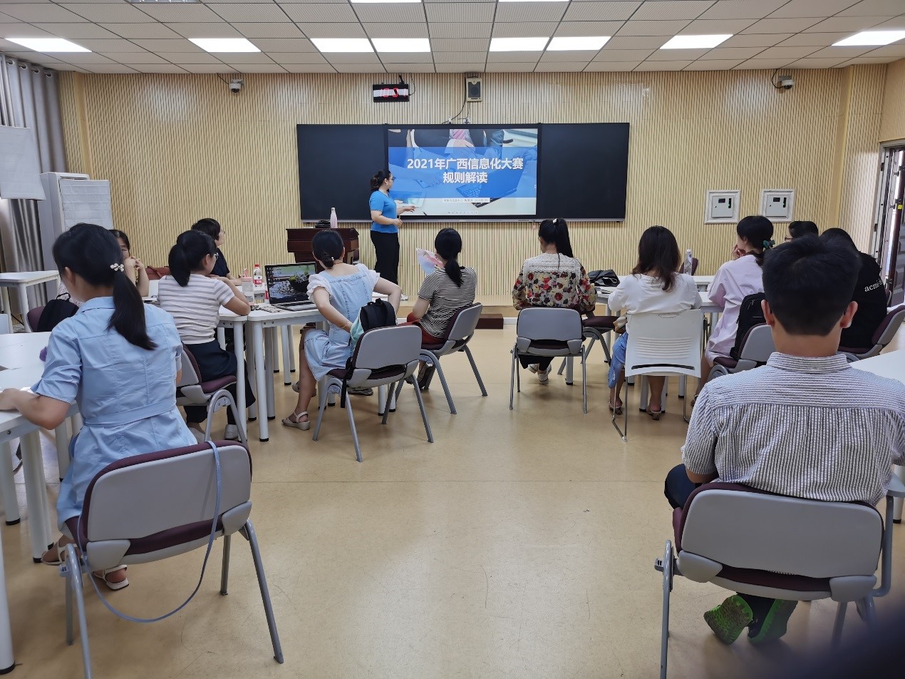为给beats365(中国区)-唯一官方网站参加“2021年第二十届广西高校教育教学信息化大赛”的老师们全面熟悉和理解大赛规则,7月13日上午在屏风校区9502,beats365(中国区)-唯一官方网站组织开展2021年广西信息化大赛规则解读培训会,此次培训会邀请到网络与信息中心的陶雁羽老师进行现场讲解和答疑,参加本次培训会的有beats365(中国区)-唯一官方网站参赛的7位教师及感兴趣的教师,同时还吸引了外国语学院、土木与建筑工程学院、商学院和旅游与风景园林学院等10多位教师参加,会议由院长助理聂瑾芳主持。