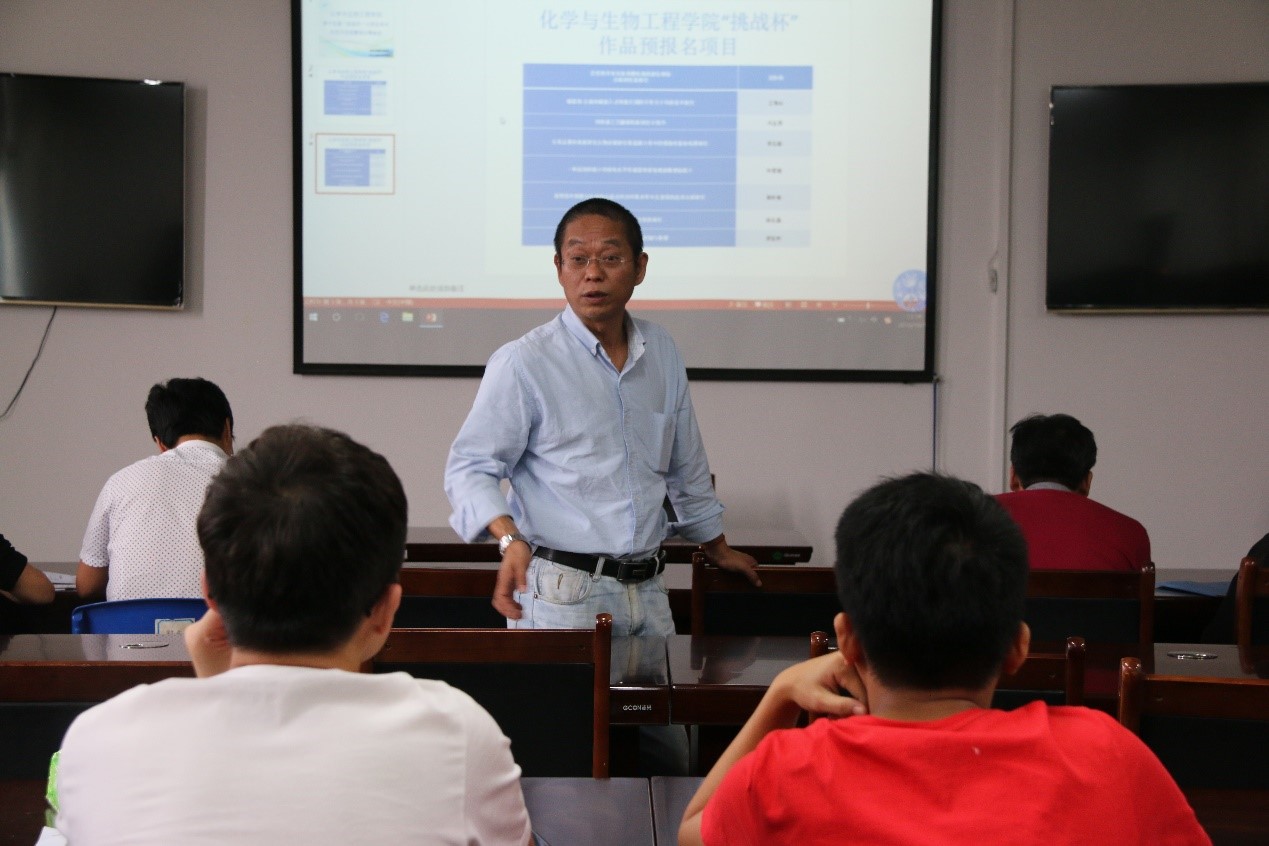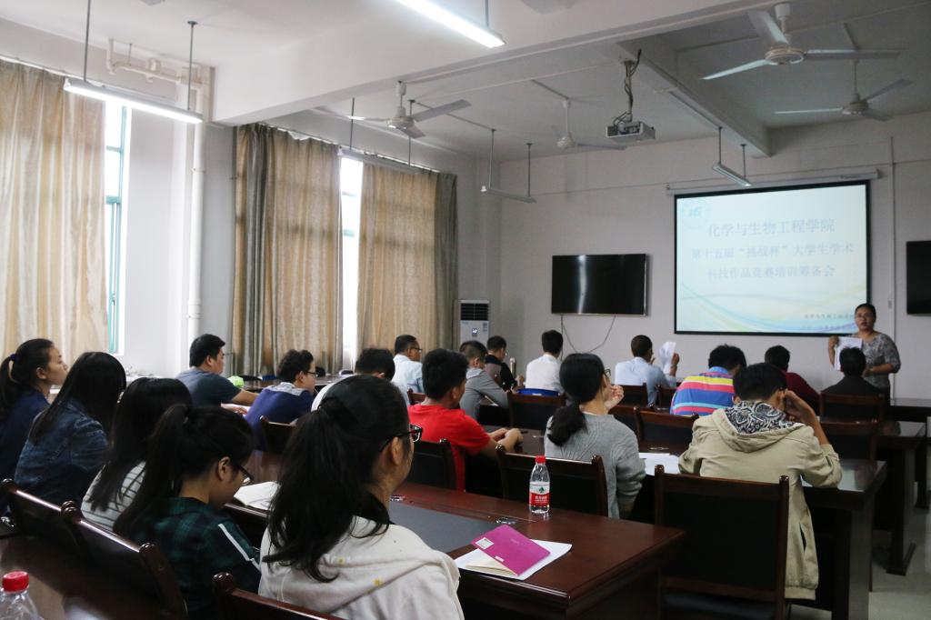 培训会开始,饶筠筠老师为同学们介绍了参加“挑战杯”竞赛作品的基本要求以及参赛的相关注意事项,细致入微的讲解,让同学们明白了该如何更好的呈现自己的作品。随后,各个参赛代表上台介绍自己的参赛项目,16个参赛项目包括农产品农药残留以及重金属含量检测仪、无酶简易微型光电生物传感器的研发、便捷式电位溶出装置的研制、果胶-Ag纳米粒子的绿色合成及抗菌性能的研究、从餐饮废油炼制生物柴油等。在提问环节,指导老师针对学生的参赛作品指出了改进之处,以及在接下来的研究考核期间应该注意的地方。