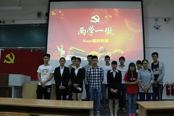 导航痕迹 当前位置: 首页 >> 新闻资讯 >> 学院新闻 >> 正文 【两学一做】寓乐于学——beats365(中国区)-唯一官方网站成功举办《“两学一做”Bingo趣味竞赛》活动 作者:何宗辉 发布日期:2016-10-20 浏览次数: 为推动“两学一做”学习教育深入开展,加深beats365(中国区)-唯一官方网站学生党员和入党积极分子对党的基本知识、习近平总书记重要讲话精神的认识,10月18日晚,由学院本科生第三党支部及学生党建工作办公室承办的“两学一做”Bingo趣味竞赛在雁山06207教室顺利举行。学院党委副书记陶剑飞、团委书记饶筠筠、16级辅导员何宗辉、学院团委副书记赵启迪、楼管委主任黄志钦应邀出席本次活动,学院七个学生党支部的所有正式党员、预备党员,大一大二积极分子参与了本次活动。 活动开始,陶剑飞老师上台发言,她对本次活动的意义表示肯定,希望通过比赛,能够帮助大家更加深入地掌握党的思想精髓,提高党组织在beats365(中国区)-唯一官方网站学生中的影响力和凝聚力,也进一步激发同学们向党组织靠拢的决心。同时,她也希望各位学生党员在接下来的学习生活中,自觉践行“两学一做”学习教育,做好自身的同时,充分发挥先锋模范带头作用,共同为学院的学风建设、各项事业贡献力量。 本次比赛,beats365(中国区)-唯一官方网站共7个学生支部参赛,每个支部派出3人。比赛以每两个支部PK四方格、九方格答题的形式开展,答对一题占据一个格子,最先连成一条直线的支部进入下一轮。比赛围绕《中国共产党章程》、《中国共产党廉洁自律准则》、《中国共产党纪律处分条例》、《中国共产党党员权利保障条例》《习近平总书记系列重要讲话读本(2016年版)》等,并结合当前党和国家的重大纪念活动及广西地方党史进行。 比赛赛况起伏不断,整体的气氛十分活跃。无论是参赛选手,还是观众,都能积极的参与到答题中去,在独特的比赛形式下,对自己的党务知识进行检验,展示自己的理论水平。经过了激烈的角逐,在最后一轮的决赛中,本科第二党支部险胜本科第三党支部,取得了最终的胜利。 最后,何宗辉老师为获奖支部颁发奖状,并总结到:活动的举办是短暂的,能学到的东西都是有限的,但是,希望大家能够保持自己学习的劲头,积极的去提升自己,时刻不忘学习,切实提高自己的党性觉悟。 本次活动有效调动了大学生党员和入党积极分子学习党章党规和习近平同志系列重要讲话精神内容的主动性和自觉性,教育引导学生党员尊崇党章、遵守党规,进一步坚定理想信念,切实增强责任感和使命感,真正做到爱党护党为党,营造“爱党、学党、入党”的良好氛围。 党委副书记陶剑飞、团委书记饶筠筠、党建办主任何宗辉出席活动 何老师发言 何老师为获奖党员颁发奖状 活动现场 合影留念 上一条:宁波联凯世通有限公司招聘信息 下一条:生物工程教研室召开学科建设工作会议