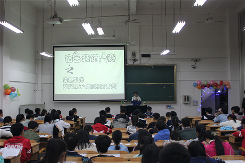 出席本次会议的有学院党委副书记陶剑飞老师、16级辅导员何宗辉老师、楼栋管理委员会全体成员以及学院15、16级宿舍长。会上,党委副书记陶剑飞老师首先发言,她为同学们分享了一个关于学霸宿舍集体考研的故事,让同学们深刻的认识到宿舍舍友间的团结、经验的分享、共同的努力对于学习生活的重要性。接着何宗辉老师就宿舍长职能、宿舍安全、宿舍卫生三大问题展开论述,特别强调了大功率电器的使用问题,希望同学们遵守宿舍规章制度,借助本次宿舍装饰大赛这个平台营造出一个良好的宿舍环境。