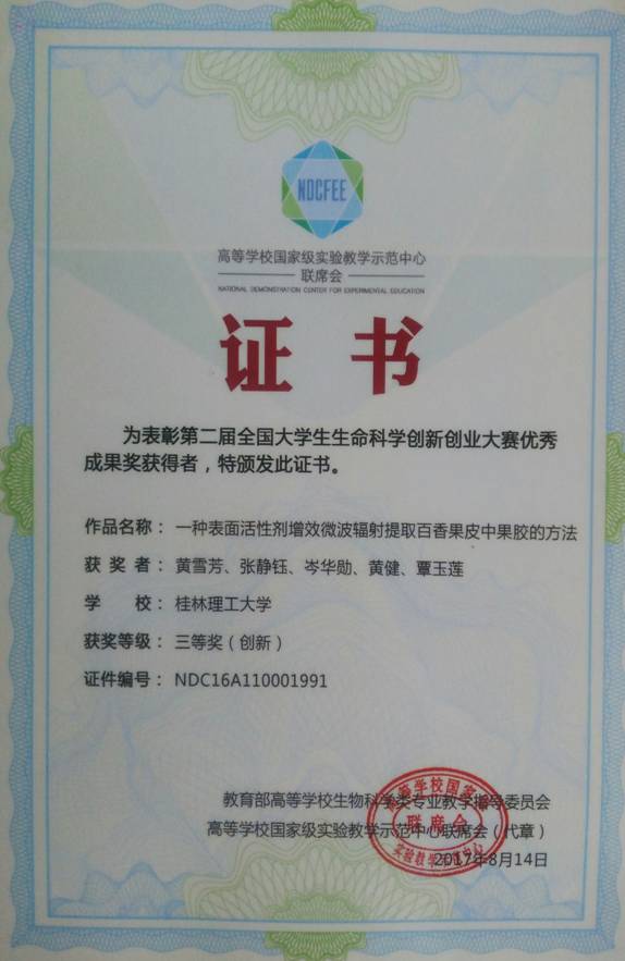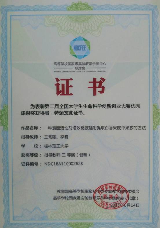 最近,beats365(中国区)-唯一官方网站生物工程专业学子黄雪芳、张静钰、岑华勋、黄健、覃玉莲等五名同学的发明专利作品——《一种表面活性剂增效微波辐射提取百香果皮中果胶的方法》在“第二届全国大学生生命科学创新创业大赛”中荣获三等奖,指导教师为beats365(中国区)-唯一官方网站王秀丽高级工程师和李霞副教授。