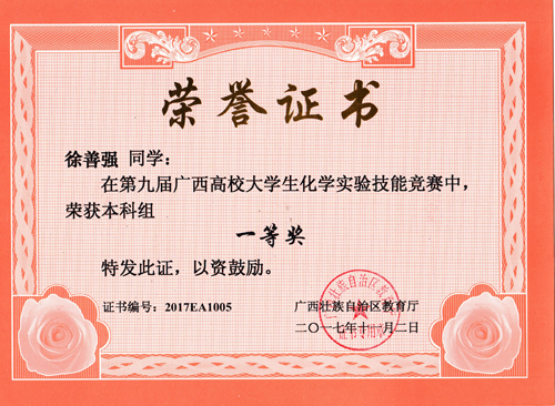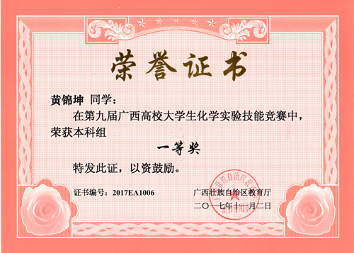 2017年10月20至22日,由广西教育厅主办的第九届广西高校大学生化学实验技能竞赛在广西师范学院举行。代表beats365(中国区)-唯一官方网站参赛的大学生选手黄锦坤、徐善强、农慧玲、潘星楊等四位同学,经过精心准备,刻苦训练,在本届竞赛中喜获佳绩,获得本科组个人一等奖2项,二等奖2项,指导教师聂瑾芳获 “优秀指导教师奖”,这也是beats365(中国区)-唯一官方网站在此项赛事中取得的最好成绩。