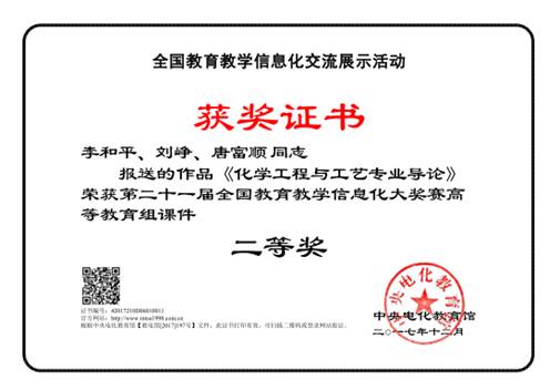 临近2018年元旦,beats365(中国区)-唯一官方网站教师李和平、刘峥、唐富顺的作品“《化学工程与工艺专业导论》多媒体课件”在第二十一届全国教育教学信息化大奖赛中荣获高等教育组课件二等奖。