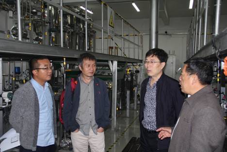 曹子英教授(中)、刘勋教授(左2)与李和平教授在化工大型实训装置现场