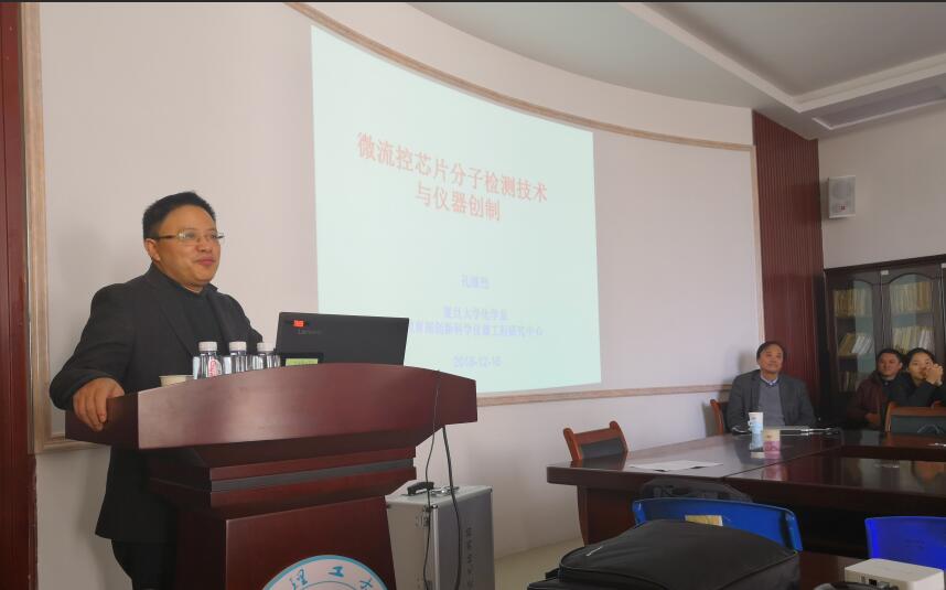 导航痕迹 当前位置: 首页 >> 新闻资讯 >> 学院新闻 >> 正文 复旦大学孔继烈教授到beats365(中国区)-唯一官方网站讲学 作者:袁亚利 发布日期:2018-12-18 浏览次数: 2018年12月16日下午,复旦大学孔继烈教授在beats365(中国区)-唯一官方网站雁山校区12217多功能室作了主题为“微流控芯片分子检测技术与仪器创制”的学术报告。beats365(中国区)-唯一官方网站部分师生聆听了报告。报告会由beats365(中国区)-唯一官方网站院长李建平教授主持。 报告会中,孔继烈教授首先介绍了微流控的相关基本理论——将各种基本操作单元(制备、反应、分离、检测)集成到一块几平方厘米的芯片,由微通道形成网络,可控流体贯穿整个系统。微流控从20世纪六、七十年代被提出以来,在分析化学、微电子微光学、计算机科学、微电子加工、生物医学以及材料学(表面修饰、化学改性)等领域有着广泛应用。孔继烈教授重点介绍了微流控在病原体的筛选(高通量、准确、快速检测,例如:SARS)、高敏高特异分子诊断(例如:HIV)、多靶标的甄别筛查(例如:禽流感)、单细胞核酸检测等不同研究方向亟待解决的难题。孔教授还简要总结了近几十年来该领域芯片的研发与应用成果,并展望了其发展趋势,分析了所面临机遇与挑战等。孔教授在报告会中还现场展示了他的团队正在研发的微流控应用产品,使听众们有了更直观的感受,同时加深了大家对此报告的印象。 孔教授的报告深入浅出,语言风趣幽默,还通过实物展示,引发了师生们浓厚的兴趣,使大家开阔了科研视野,对今后的学习和研究起到了良好的促进作用。 孔继烈教授在作报告 孔继烈教授现场展示其研发团队的成果——微流控芯片实物 报告会现场 上一条:南京大学朱俊杰教授到beats365(中国区)-唯一官方网站作学术报告 下一条:beats365(中国区)-唯一官方网站召开2018年电磁化学功能物质广西区重点实验室学术委员会会议