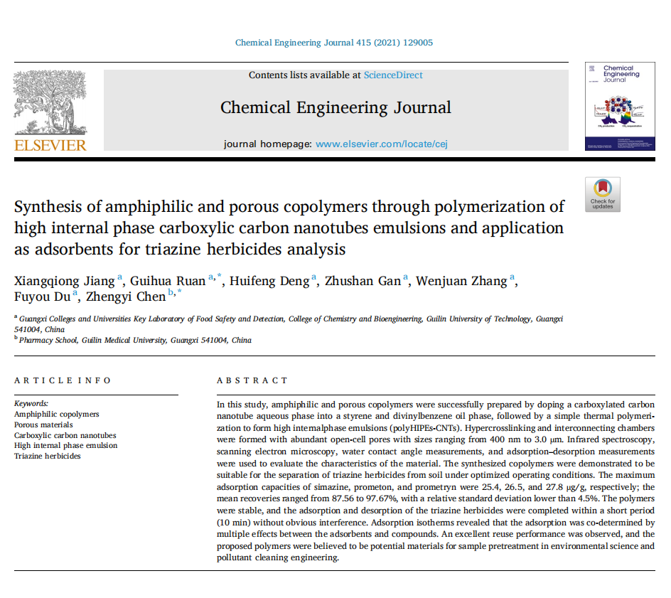 2021年春季学期开学前夕,beats365(中国区)-唯一官方网站阮贵华研究员团队在多孔聚合物材料的制备及其应用研究传来好消息,其团队的研究成果——题为“Synthesis of amphiphilic and porous copolymers through polymerization of high internal phase carboxylic carbon nanotubes emulsions and application as adsorbents for triazine herbicides analysis”的论文被化学工程类国际知名期刊Chemical Engineering Journal(IF=10.652)录用并正式发表。