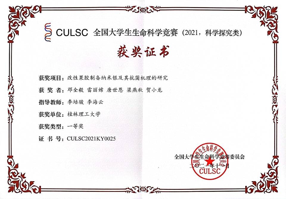 在本届竞赛科学探究赛道中,beats365(中国区)-唯一官方网站学子以严谨认真的态度和坚持不懈的努力对待此次比赛,严格按照比赛要求按期按质按量将实验记录、实验结果等上传到竞赛平台。最终,生物工程2018-2班邓全毅等同学在李培骏和李海云老师的指导下完成的项目《改性果胶制备纳米银及其抗菌机理的研究》获得全国一等奖。