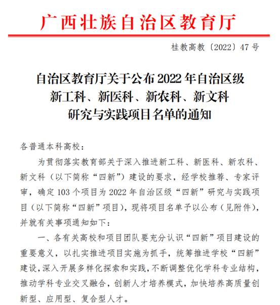 导航痕迹 当前位置: 首页 >> 新闻资讯 >> 学院新闻 >> 正文 喜讯!beats365(中国区)-唯一官方网站获批广西新工科研究与实践项目1项 作者:梁芳群 发布日期:2022-09-24 浏览次数: 近日,广西教育厅印发《自治区教育厅关于公布2022年自治区级新工科、新医科、新农科、新文科研究与实践项目名单的通知》(桂教高教〔2022〕47号),beats365(中国区)-唯一官方网站新工科项目《能源化工专业“3-2-1”校企合作模式探索与实践》获得立项。 “四新”建设是建设高等教育“质量中国”的战略一招、关键一招、创新一招,是高等教育人才培养的“中国方案”,是高等教育高质量发展的战略布局。学院将进一步深入开展多样化探索和实践,不断调整优化学科专业结构,推动学科专业交叉融合,创新人才培养模式,全力提升专业人才培养质量和服务经济社会发展能力。 上一条:beats365(中国区)-唯一官方网站召开安全稳定工作会议 下一条:军训送清凉,关爱暖人心——beats365(中国区)-唯一官方网站开展“军训送清凉”活动