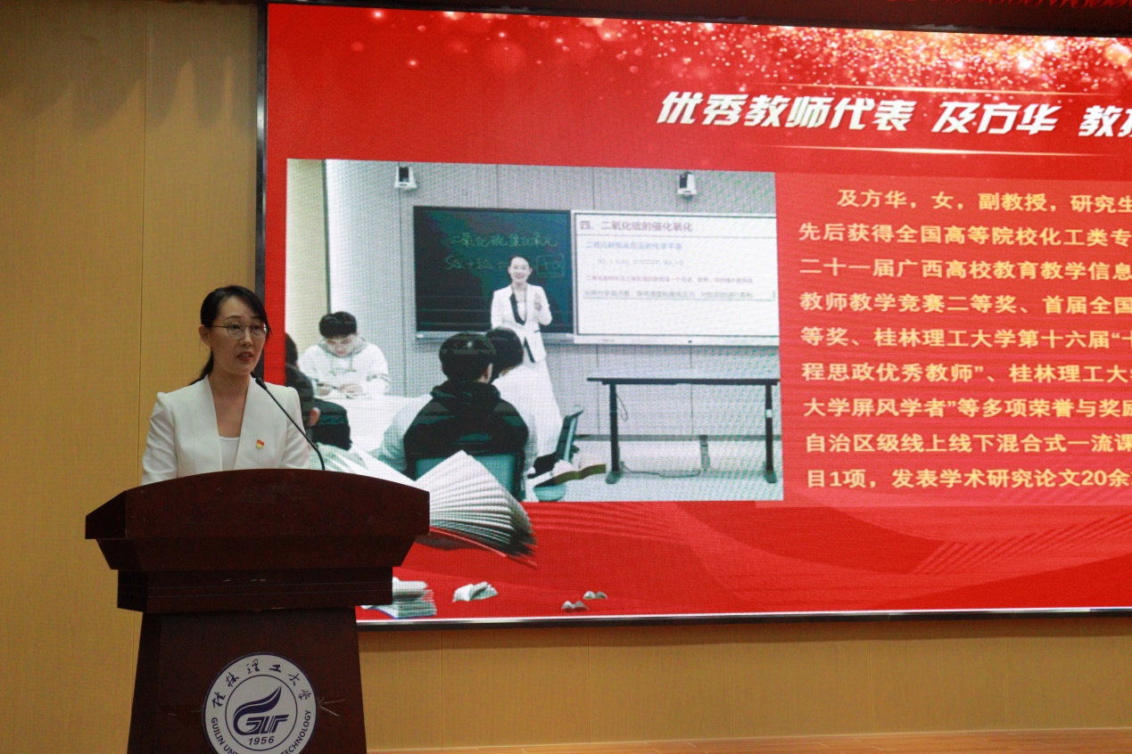 导航痕迹 当前位置: 首页 >> 新闻资讯 >> 学院新闻 >> 正文 躬耕教坛 强国有我--化学与生物工程学院庆祝2023年教师节活动 作者:刘耀明 发布日期:2023-09-11 浏览次数: 为深入贯彻落实习近平新时代中国特色社会主义思想和党的二十大精神,充分展现新时代新征程高质量教师队伍建设的突出成就和广大教师立德树人、自信自强的精神风貌,化生学院以迎接党的二十大胜利召开后的第一个教师节为契机,于9月8日下午在雁山校区图书馆报告厅开展以“躬耕教坛 强国有我”为主题的教师节庆祝活动。学校党委常委、副校长王玫、学院党委书记彭代江、院长匡小军以及学院全体教师、学生代表等220余人参加了本次活动。 活动伊始,学校副校长王玫发表了热情洋溢的致辞,他带领大家一同回顾了化学与生物工程学院过去一年在党建、学科专业建设、教学、科研等方面取得的成绩,指明了化生学院未来的发展方向和重点工作,并对全院教师提出了三点希望:一是以政治建设为统领,加强党的建设,聚势谋远;二是以立德树人为根本,加强内涵建设,凝聚合力;三是以精耕细作为要求,增强实干意识,全员争先。 随后,化生学院院长匡小军宣读了《关于学院表彰“从教三十年、二十五年、二十年、十五年、十年教师”及教书育人、科研育人、管理育人、就业工作突出贡献奖的决定》,并进行了表彰活动。 会上,优秀教师代表及方华老师分享了从教多年来的心得感悟,同时学生们怀着感激、感恩的心,借此机会对他们敬爱的老师进行深情告白,师恩难忘,同学们的健康成长,学有所成也是老师们最大的愿望。 本次庆祝教师节活动的举办,对于深入学习贯彻习近平总书记在中共中央政治局第五次集体学习和在北京育英学校考察时的重要讲话精神,深刻认识在教育强国、科技强国、人才强国建设中肩负的光荣使命与重大责任,以人民教育家为榜样,牢固树立“躬耕教坛,强国有我”的志向与抱负,以培养堪当民族复兴大任的时代新人为己任,全员全方位全过程强化师德养成,争做“四有”好老师和“四个引路人”,努力培养更多德智体美劳全面发展的社会主义建设者和接班人。 王玫副校长致辞 匡小军院长讲话 颁奖 优秀教师代表及方华发言 合影留念 上一条:beats365(中国区)-唯一官方网站召开2023年秋季学期师德师风警示教育会议 下一条:beats365(中国区)-唯一官方网站召开2023年秋季学期全院教职工大会