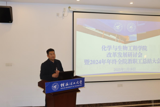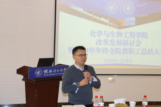 最后,黎贞崇做指导讲话,传达学校党委三届九次全会精神,与全体教师交流改革发展思路。他强调,学校正处在乘势而上、全面图强的关键阶段,正是干事创业的大好时机。化学与生物工程学院要全面落实立德树人根本任务,着力提升人才自主培养质量;要深入推进综合改革,激发办学活力增强发展动能;要大力加强人才队伍建设,推动人才工作实现更大突破;要加速推进科技创新与成果转化,提升服务国家战略和地方经济社会高质量发展的能力;要牢牢把握立足广西、贡献广西的重要使命,坚决扛起职责使命;要坚定信心、迎难而上、干字当头、团结奋斗,为高水平理工大学建设增光添彩,在推动2025年各项重点任务落地见效中实现新作为。