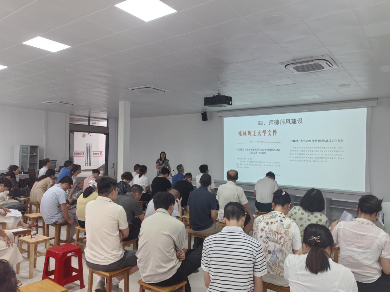 为深入学习贯彻全国教育大会精神和习近平总书记关于教育的重要论述,进一步加强师德师风建设,严明纪律规矩,不断提升教师队伍教育教学水平,7月8日上午,beats365(中国区)-唯一官方网站召开师德师风建设与课堂教学质量专题工作会议,全体教职工参会。会议由学院副院长李霞主持。 李霞副院长带领大家共同学习了《beats365(中国区)-唯一官方网站2025年师德师风建设工作方案》、《beats365(中国区)-唯一官方网站本科教学工作规范》、《beats365(中国区)-唯一官方网站教学事故认定与处理办法》等文件,通报了一系列真实且极具代表性的案例,深入剖析了师德失范行为所带来的严重危害和不良后果,为全体教师敲响了警钟。她要求全体教师要以这些案例为镜鉴,时刻保持清醒的头脑,坚守师德底线,做到言传身教、率先垂范,以高尚的师德风范感染学生,努力成为学生成长道路上的引路人。 另外,针对教学质量月出现的教学纪律不够严明、教学行为不够规范等问题,李霞副院长带领大家重温了课堂管理相关文件要求,并强调课堂教学是人才培养的核心环节,必须全面加强教学管理,切实提升教育教学质量,推动学院教育教学工作再上新台阶。 学习现场(一) 学习现场(二) (一审:马文硕 二审:袁亚利 三审:李霞)