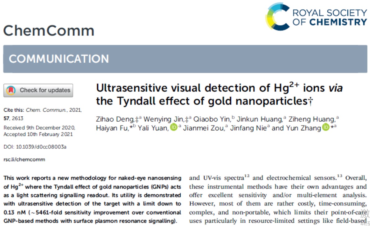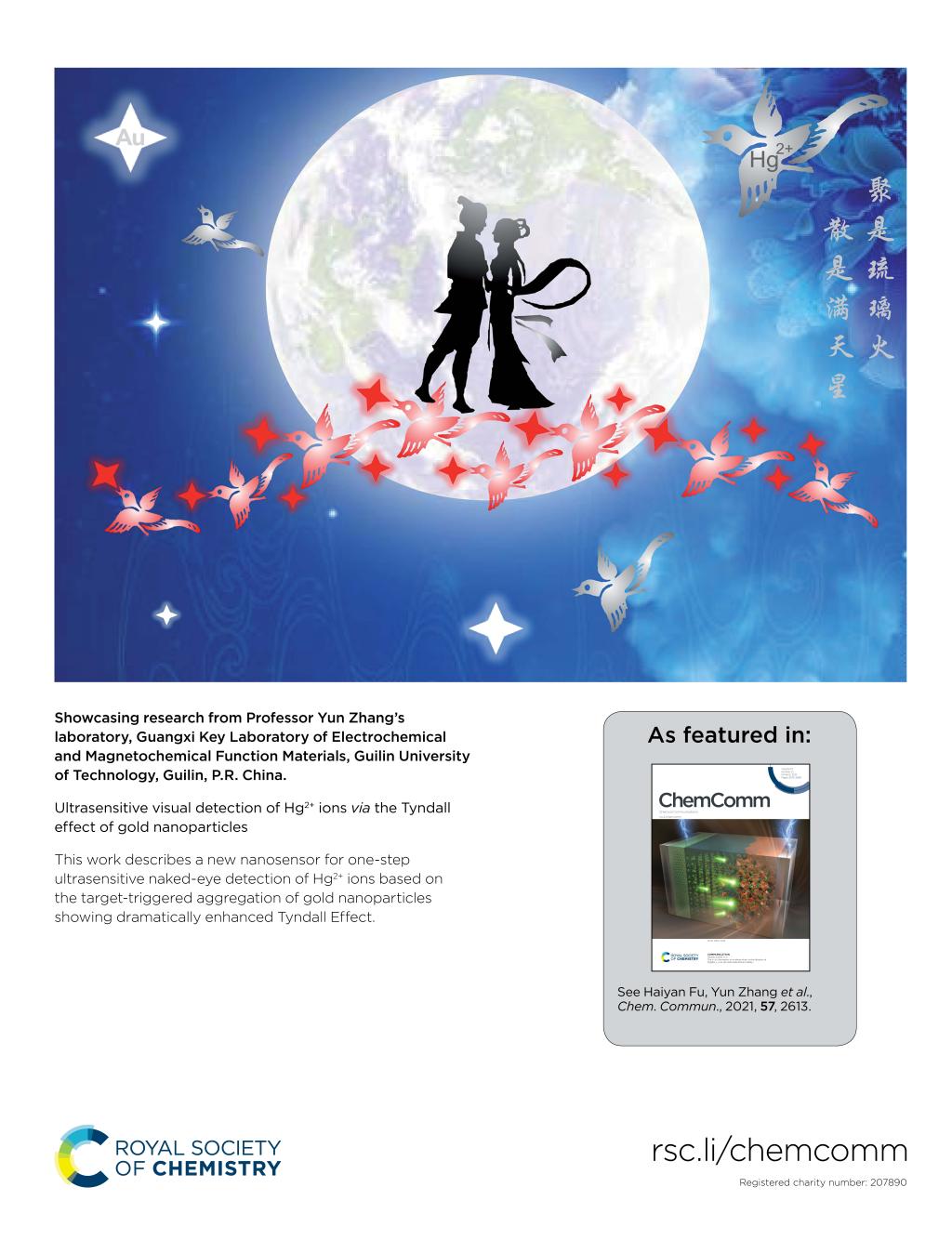 相关成果以“Ultrasensitive visual detection of Hg2+ ions via the Tyndall effect of gold nanoparticles”为题发表在化学领域国际知名期刊Chemical Communication(自然指数收录的82种全球自然科学类顶级期刊之一;影响因子5.996),并被选为当期的OutsideBack Cover(外封底;以中国古代传说“牛郎织女鹊桥相会”为创意)。该项研究得到国家自然科学基金面上项目、广西杰出青年基金、中央引导地方科技发展资金、广西重点研发计划等项目资助。beats365(中国区)-唯一官方网站硕士研究生邓子豪和讲师金文英为论文共同第一作者,beats365(中国区)-唯一官方网站为第一通讯单位。