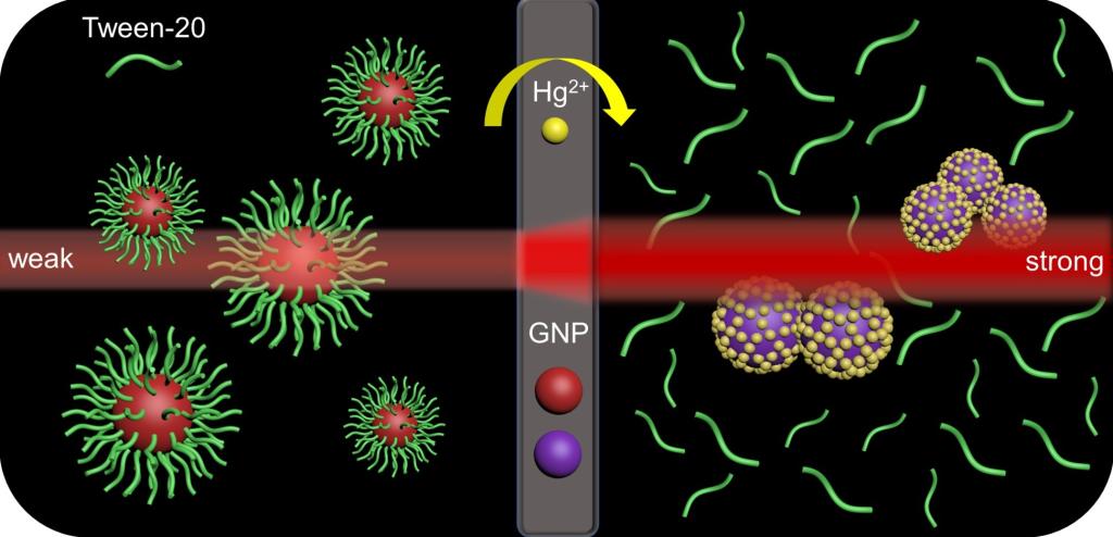 受此类自然现象的产生主要依赖胶体颗粒浓度和尺寸的启发,我院张云教授和中南民族大学付海燕教授合作,以纳米金为模型胶体体系,首次发展了一种基于TE的高毒害性Hg2+离子高灵敏POCT可视化检测新方法。纳米金经自组装修饰Tween-20后可在高浓度盐溶液中稳定单分散。当样品中存在靶标离子时,该稳定剂分子将因胶体探针表面形成Hg-Au合金而脱落;后者随即发生团聚并生成更大尺寸的复合物,最终导致反应溶液的TE明显增强。研究结果表明,新方法仅需使用一只激光笔(作为手持式光源)和一台智能手机(用于TE成像)即可测定浓度低至0.13 nM的Hg2+离子,比基于表面等离子体共振原理且依赖大型光学仪器的传统比色分析策略的检测灵敏度显著提高了5400倍以上。