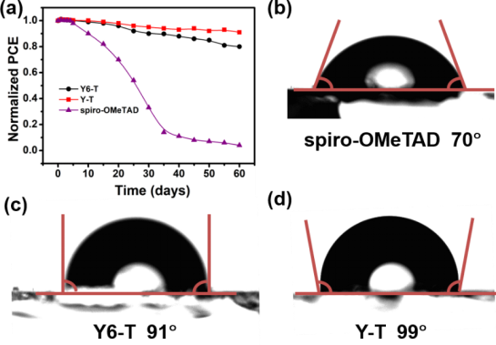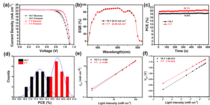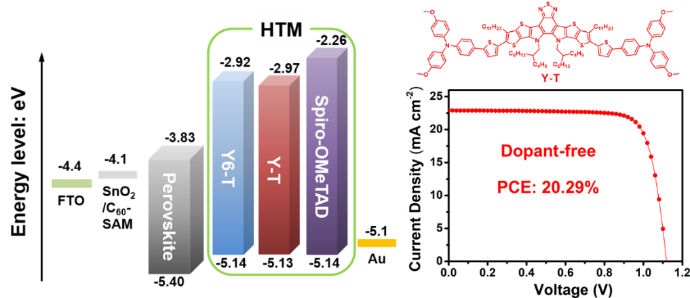 导航痕迹 当前位置: 首页 >> 科学研究 >> 学术动态 >> 正文 beats365(中国区)-唯一官方网站海杰峰副教授在国际知名期刊《Advanced Functional Materials》上发表免掺杂空穴传输材料修饰钙钛矿太阳能电池研究成果 作者:吴浩 发布日期:2021-10-27 浏览次数: 目前有机/无机杂化钙钛矿太阳能电池(PSCs)发展迅猛,其光电转化效率(PCE)已经突破了25%。空穴传输材料(HTMs)作为钙钛矿太阳能电池的重要组成部分之一,对器件的效率、稳定性以及大规模应用具有至关重要的影响。目前高效率的PSCs通常选用成本昂贵的spiro-OMeTAD作为空穴传输层,但是spiro-OMeTAD需要采用锂盐、钴盐、叔丁基吡啶等掺杂剂来提升其迁移率和导电性,这些亲水分子会降低电池的长期稳定性,因此低成本非掺杂空穴传输材料的开发对于高效稳定PSCs的商业化非常重要。 近期,beats365(中国区)-唯一官方网站海杰峰副教授与嘉兴学院中澳先进材料与制造研究院尹新星&李在房课题组合作,利用两步合成法以缺电子大稠环单元作为中心核,三苯胺单元作为端基构建了两个新型分子Y6-T和Y-T,并且将其作为非掺杂空穴传输层材料应用于PSCs。与spiro-OMeTAD相比,Y6-T和Y-T具有合适的HOMO和更高的空穴迁移率以及较好的疏水性。经器件优化后,基于非掺杂Y-T的钙钛矿太阳能电池展现出令人满意的20.29%效率,高于基于非掺杂Y6-T的器件(18.82%)和基于掺杂spiro-OMeTAD的器件(19.24%)。同时相对于使用掺杂spiro-OMeTAD的器件,基于这两种非掺杂HTM材料的器件表现出更加优异的稳定性。这项工作为非掺杂HTM材料提供了一种有效的设计策略,同时对钙钛矿太阳能电池商业化起到一定的推动作用。相关结果以“Dopant-Free Hole Transport Materials Based on a Large Conjugated Electron-Deficient Core for Efficient Perovskite Solar Cells”为题在发表于Advanced Functional Materials(SCI一区TOP期刊,影响因子18.8)。 HTM分子的设计 在高效的n-i-p型PSCs,研究者通常通过添加掺杂剂来提升spiro-OMeTAD层的空穴迁移率。因此,开发具有高空穴迁移的非掺杂HTM材料具有重要意义。其中,一种有效的策略是采用具有大平面型结构的分子,利用更强的分子间作用力以及更加紧密的π-π堆积来实现空穴迁移率的提升。另一种策略是引入缺电子单元构建D-A结构,促进分子内电子离域和提升电荷传输。研究者协同两种策略,以缺电子大稠环--双并噻吩并吡咯并苯并噻二唑(BTP)为核,三苯胺为端基以及噻吩为π桥设计合成了两个HTM分子Y6-T和Y-T。 图1 HTM材料Y6-T和Y-T的分子结构以及理论计算的分子前沿轨道 空穴迁移率、荧光和时间分辨光谱分析 Y6-T和Y-T拥有合适的HOMO能级(~-5.14 eV),比spiro-OMeTAD高一倍的空穴迁移率(1.72~1.81×10-4 cm2 V-1 s-1)。稳态光致发光(PL)和时间分辨光致发光(TRPL)光谱显示非掺杂的Y6-T和Y-T比掺杂后的spiro-OMeTAD具有更快速和高效空穴抽取和传输能力。 图2 (a) PSC中各层材料的能级;(b) SCLC方法测得的空穴迁移率电流密度-电压特性曲线;(c) 荧光光谱;(d) 时间分辨荧光光谱。 PSC的光电性能 研究者在n-i-p结构的PSCs中,分别将Y6-T和Y-T作为非掺杂HTM材料,器件结构为FTO/SnO2/C60-SAM/MA0.7FA0.3PbI3/PEAI/HTM/Au。基于非掺杂的Y6-T器件效率为18.82%,其中开路电压(VOC)为1.108 V,短路电流(JSC)为22.90 mA cm-2,填充因子(FF)为74.18%,比掺杂的spiro-OMeTAD器件效率(19.24%)略低。令人惊奇的是,基于非掺杂的Y-T器件效率达到20.29%,其中VOC为1.118 V,JSC为22.90 mA cm-2,填充因子(FF)为79.25%。 图3 (a) 器件的J-V曲线图;(b) 器件的EQE曲线;(c) 器件的稳态输出效率;(d) 器件效率统计直方图;(e) 器件的短路电流密度-光强(JSC-Plight)关系曲线;(f) 器件的开路电压-光强(VOC-Plight)关系曲线。 PSC的长期稳定性和接触角测试 HTM层对于器件的长期稳定性也至关重要,研究者测试了Y6-T和Y-T的接触角来证实其疏水性。之后还对基于非掺杂Y6-T和Y-T的未封装器件的稳定性进行了测试。如图4(a)所示,当三种器件保存在30%湿度的空气中,60天后基于掺杂spiro-OMeTAD的器件效率下降了95%,而基于非掺杂Y-T的器件维持着最初效率的90%。 图4 (a) 未封装器件稳定性;接触角实验 (b) spiro-OMeTAD;(c) Y6-T;(d) Y-T 总的来说,我们合成了两种新型的基于大缺电子稠环核心的非掺杂HTM分子Y6-T和Y-T。通过器件优化,基于非掺杂Y-T的n-i-p型钙钛矿太阳能电池的效率达到20.29%,并且具有良好的长期稳定性。研究者的工作证明适当的缺电子大稠环核是一种具有潜力的构建高效率钙钛矿太阳能电池的非掺杂HTM材料的单元。海杰峰副教授、2019级研究生吴浩和嘉兴学院尹新星博士为该论文的共同第一作者,beats365(中国区)-唯一官方网站为第一完成单位。以上研究工作得到广西自然科学基金面上项目和广西电磁化学功能物质重点实验室基金等资助。 全文链接为:https://doi.org/10.1002/adfm.202105458 上一条:beats365(中国区)-唯一官方网站温玉清教授课题组在镁合金表面涂层领域再次取得重要进展 下一条:广西农业科学院孙健研究员到beats365(中国区)-唯一官方网站作学术报告