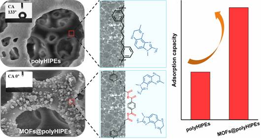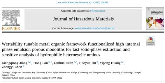 导航痕迹 当前位置: 首页 >> 科学研究 >> 学术动态 >> 正文 beats365(中国区)-唯一官方网站阮贵华研究员课题组在多孔聚合物材料的制备及其应用研究领域再次取得重要进展 作者:阮贵华 发布日期:2022-05-20 浏览次数: 近日,beats365(中国区)-唯一官方网站阮贵华研究员课题组在多孔聚合物材料的制备及其应用研究领域再次取得重要进展。团队研究成果以题为Wettability tunable metal organic framework functionalized high internal phase emulsion porous monoliths for fast solid-phase extraction and sensitive analysis of hydrophilic heterocyclic amines的论文被环境科学与生态学类国际知名期刊Journal of Hazardous Materials(IF=10.588)录用并正式发表。该项研究得到国家自然科学基金以及广西自然科学基金等多个项目的资助,beats365(中国区)-唯一官方网站硕士研究生蒋香琼和潘红为论文共同第一作者,beats365(中国区)-唯一官方网站为第一通讯单位,阮贵华研究员和黄艺鹏老师为共同通讯作者。 复杂样品基质中痕量物质的高效分离富集在样品前处理领域具有挑战性。目前关于MOFs@polyHIPEs复合物的研究主要集中在解决polyHIPEs的不稳定性,所得复合物的力学性能差,低的MOFs负载和孔隙堵塞等问题上。然而通过控制MOFs的比例来调节MOFs@polyHIPEs的表面润湿性尚未见报道。阮贵华研究员课题组研究中通过对MOFs材料的表面改性修饰并调整负载量来直接调控多孔材料MOFs@polyHIPEs表面润湿性,从而提高吸附性能,并有效避免改性MOFs的分解,该研究成功应用于复杂食品样品中痕量杂环胺的分离富集与检测,为发展新型固相萃取材料提供了可行的思路与解决方案。 全文链接:https://doi.org/10.1016/j.jhazmat.2022.128565 论文相关研究思路 论文发表情况 上一条:beats365(中国区)-唯一官方网站黄斌副教授在国际权威期刊《Small》上发表锂离子电池层状高镍正极材料及其前驱体相关的前沿综述 下一条:2022 CCL-GLUT化学前沿论坛(第一期):无机材料化学前沿论坛