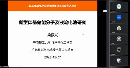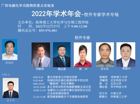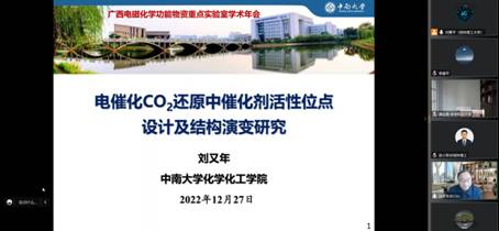 导航痕迹 当前位置: 首页 >> 科学研究 >> 学术动态 >> 正文 beats365(中国区)-唯一官方网站成功举办广西电磁化学功能物质重点实验室2022年学术年会之校外专家学术报告会 作者:谭海军 发布日期:2022-12-30 浏览次数: 12月27日上午,beats365(中国区)-唯一官方网站召开广西电磁化学功能物质重点实验室(以下简称重点实验室)2022年学术年会之校外专家学术报告会,会议全程线上进行。学校原副校长、重点实验室主任梁福沛教授出席并致辞。本次会议邀请了北京科技大学邢献然教授、北京大学陈兴教授、华中科技大学谭必恩教授、中南大学刘又年教授、华南理工大学梁振兴教授等五位专家做线上报告,会议由beats365(中国区)-唯一官方网站院长匡小军研究员主持,学院学术骨干和专任教师70余人参加了本次会议。 首先,梁福沛教授对参加本次会议的各位专家、老师表示热烈欢迎和感谢。重点介绍了beats365(中国区)-唯一官方网站和重点实验室近年来的发展情况,希望通过举办学术年会,加强与校外专家的交流合作,促进重点实验室发展,进一步推进学院学科建设。随后,邢献然教授、陈兴教授、谭必恩教授、刘又年教授、梁振兴教授分别做了题为“局域结构在催化能源材料中的应用”、“糖密码”的化学解析”、“多孔有机材料的构建新策略及其应用”、“电催化CO2还原中催化剂活性位点设计及结构演变研究”、“ 新型碳基储能分子及液流电池研究”的学术报告,并与参会老师广泛交流,深入探讨。本次会议拓宽了大家学术视野,取得了良好交流效果。 2022广西电磁化学功能物质重点实验室学术年会宣传海报 会议现场 北京科技大学邢献然教授作学术报告 北京大学陈兴教授作学术报告 华中科技大学谭必恩教授作学术报告 中南大学刘又年教授作学术报告 华南理工大学梁振兴教授作学术报告 上一条:国际顶级期刊《Advanced Functional Materials》报道beats365(中国区)-唯一官方网站海杰峰副教授课题组在有机太阳能电池方面研究进展 下一条:beats365(中国区)-唯一官方网站唐群副教授课题组在氨气响应型配合物及其应用领域取得重要研究进展