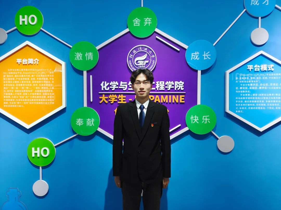 该生学习刻苦、踏实认真,在大学学习期间严格要求自己,学习成绩名列前茅,积极参加学校、学院各项活动,坚持德智体美劳全面发展。自大一至大四一直担任班级班长,曾任学院学生会执行主席,现任本科生第一党支部副书记;曾获得国家励志奖学金、广西区政府奖学金、校级特等奖学金,曾获校级三好学生、优秀团员、优秀共青团干部、优秀学生干部、社会实践活动先进个人、社会工作先进个人等荣誉称号;通过全国大学生英语四级,参与了国家级大学生创新实验计划项目1项,公开发表专利1篇——《一种三乙烯二胺衍生物手性催化剂及其合成方法》。