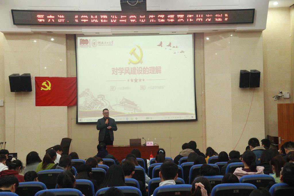 导航痕迹 当前位置: 首页 >> 党建工作 >> 学习贯彻习近平新时代中国特色社会主义思想主题教育 >> 正文 【党史学习教育】学院第二十二期预备党员培训班第六讲——《学风建设与党员的先锋模范作用发挥》 作者:熊艳 梁朝东 发布日期:2021-11-26 浏览次数: 为提高我校预备党员的党性修养,11月25日晚,学院党委副书记李南老师在萃华楼报告厅为预备党员讲授主题为《学风建设与党员的先锋模范作用发挥》主题党课。 首先,李南书记对学风建设发表了自己的见解,学风是学习者世界观与人生观的具体体现,表示学习者要不断的求知进取、完善自我和追求卓越。随后,李南书记以其他高校实际出发,发现高校学风建设存在的主要问题,总结出了高校大多数学生学习目标不够明确,导致学习不积极等消极情况,以及课堂不严谨,师生交流不充分等问题。最后,他以我校学风建设的经验和做法,给出了解决学风建设问题的方法,“抓教风,促学风”;“抓管理,促学风”;“抓氛围管理,促学风”等;特此,他还特别着重讲解学生党员要在学风建设中如何发挥先锋模范作用。 通过此次党课培训的学习,预备党员们了解到学风建设的重要性,也学会如何在学风建设中起到发挥党员的先锋模范作用。 党课现场(一) 党课现场(二) 上一条:【党史学习教育】学院第二十二期预备党员培训班第七讲——《中国共产党章程》 下一条:【党史学习教育】学院第二十二期预备党员培训班第五讲---《党纪党规与党风廉政建设》