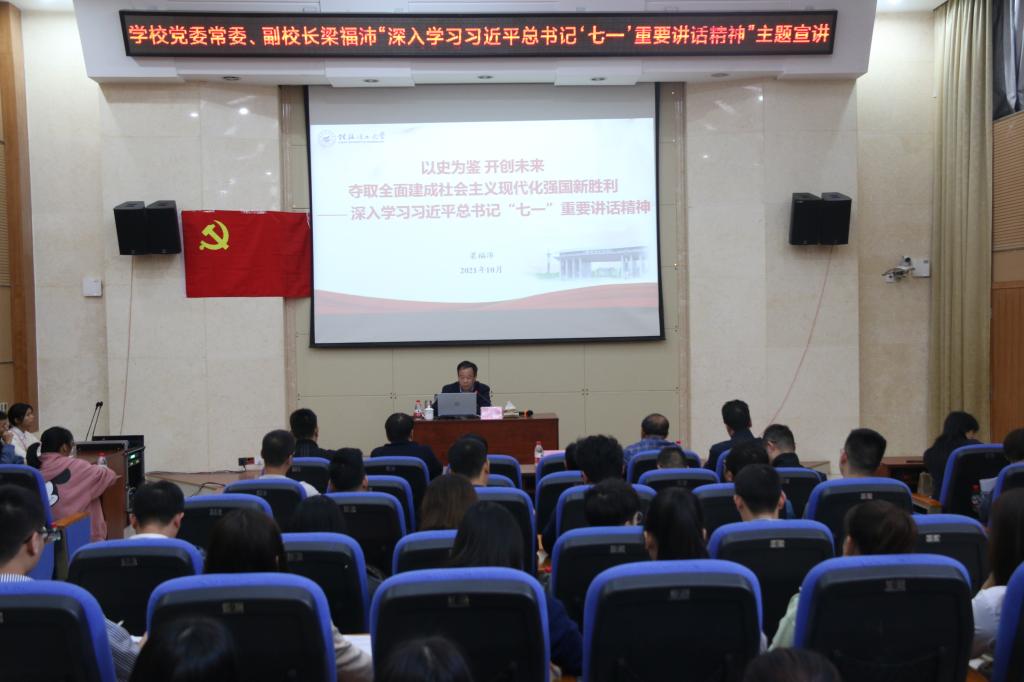 导航痕迹 当前位置: 首页 >> 党建工作 >> 学习贯彻习近平新时代中国特色社会主义思想主题教育 >> 正文 【党史学习教育】学校党委常委、副校长梁福沛为化学与生物工程学院、教务处、招生就业处、人文素质教育教学部、网络与信息中心、继续教育学院党员师生作“深入学习习近平总书记‘七一’重要讲话精神”专题宣讲 作者:熊艳 梁朝东 发布日期:2021-10-27 浏览次数: 为深入学习习近平总书记“七一”重要讲话精神,学校党委常委、副校长梁福沛于10月26日下午在雁山校区萃华楼报告厅为党员师生作《以史为鉴,开创未来夺取全面建成社会主义现代化强国新胜利——深入学习习近平总书记“七一”重要讲话精神》专题宣讲,化学与生物工程学院、教务处、招生就业处、人文素质教育教学部、网络与信息中心、继续教育学院党员师生代表参加本次宣讲。宣讲会由化学与生物工程学院党委书记彭代江同志主持。 宣讲会上,梁福沛副校长以习近平总书记在庆祝中国共产党成立100周年大会上的重要讲话精神为切入点,分别从“深入把握习近平总书记‘七一’重要讲话精神的新思想、新观点、新要求”“深入把握中国共产党百年奋斗主题和伟大成就”“深入把握全面建成社会主义现代化强国的根本要求”和“深入贯彻习近平总书记‘七一’重要讲话精神”四个方面进行宣讲。首先,梁副校长讲解了为什么习近平总书记“七一”重要讲话是闪耀着马克思主义真理光芒的纲领性文献,为什么这篇重要讲话是能够激励全党全国各族人民同心同德、满怀豪情地向全面建成社会主义现代化强国进军的动员令和行动指南。随后,梁副校长回顾中国共产党百年的奋斗和伟大的成就,讲述了中国共产党如何带领中华民族走向伟大的复兴之路,深入阐释了全面建成社会主义现代化强国的根本要求。最后,梁副校长呼吁广大青年在新时代中,要坚定崇高的理想信念,坚持党的全面领导,同时要在学习中增长知识、在工作中增长才干,苦练本领,为成为全面建设社会主义现代化国家的先锋和栋梁而不断前进。 通过此次专题宣讲,党员师生对习近平总书记“七一”重要讲话精神有了更加深入的认识。纷纷表示,要更加自觉地用习近平总书记“七一”重要讲话精神武装头脑、指导实践、推动工作,积极将讲话精神成果转化到各项工作中去,进一步坚定信念,勇担使命,无私奉献。 梁福沛副校长作主题宣讲 宣讲会现场 上一条:【党史学习教育】beats365(中国区)-唯一官方网站本科生第三党支部开展“深入学习习近平总书记“七一”重要讲话精神”宣讲会 下一条:【党史学习教育】离退处干部李少游教授为beats365(中国区)-唯一官方网站师生讲授“了解桂工历史,传承桂工精神”主题党课