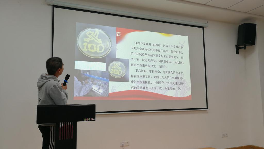 导航痕迹 当前位置: 首页 >> 党建工作 >> 学习贯彻习近平新时代中国特色社会主义思想主题教育 >> 正文 【党史学习教育】学院举办第一届微生物培养基艺术作品大赛——“微生物的艺术” 作者:熊艳 发布日期:2021-05-25 浏览次数: 奋斗百年路 启航新征程。为进一步推进学院党史学习教育走深走实、入脑入心,迎接建党100周年,学院党委于5月21日下午在雁山校区15105教室举办第一届微生物培养基艺术作品大赛----“微生物的艺术”。 比赛现场,各参赛团队代表依次展示微生物菌落作品,分享作品的制作过程和实验经验,作品包括党旗、建党100周年等图案。李霞副院长总结发言,首先祝贺本届比赛取得圆满成功,希望学院师生在今后的学习工作中不断提高自身专业素质,同时提升自身思想政治素养,促使党史学习教育入眼入脑入心。本次比赛经评委打分等环节,共评出一等奖1项、二等奖2项、三等奖3项和优秀奖4项。 本次比赛充分发挥学院专业特色,以菌为心,寄情于皿,将党史学习教育充分融入专业知识教育中,激励广大师生党员做到“学史明理、学史增信、学史崇德、学史力行”,以更加优异的成绩,喜迎建党一百周年。 比赛作品 比赛现场 合影留念 上一条:学院组织党员发展对象、预备党员参加志愿服务活动 下一条:【党史学习教育】学院党员师生代表悼念袁隆平院士